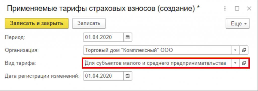 Завершающим этапом будет выбор даты изменения 01.04.2020, в строке Вид тарифа выбираем Для субъектов малого и среднего предпринимательства. Записываем и закрываем документ.