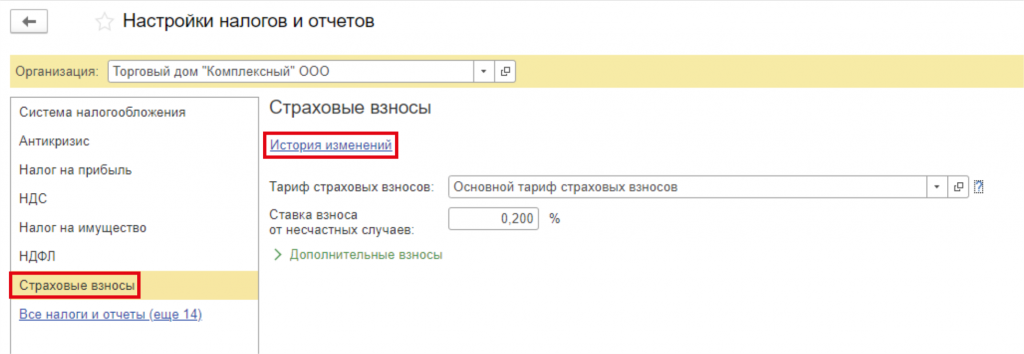 Следующим шагом будет выбор вкладки Страховые взносы, нажимаем на гиперссылку История изменений
